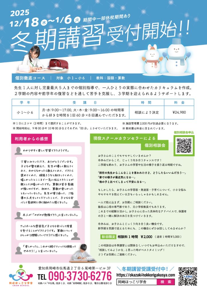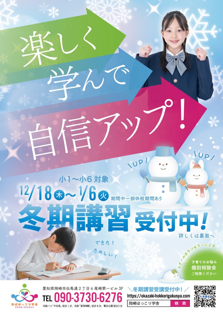 2025冬期講習の申し込みがスタートしました! 投稿日 2025-11-19 著者 siteup2-okazaki-hokkorigakusya カテゴリー お知らせ 「算数のテスト、また30点台だった…」「国語の読解が全然できていない」「勉強に対して自信をなくしているみたい」そんな心配を抱えている保護者様も多いのではないでしょうか。「塾には行ってるんだけど、成績が伸び悩んでいて…」「冬休みの間に、少しでも苦手を克服してほしい」もしそんな想いをおもちでしたら、ぜひ当塾の冬期講習にご参加ください! 詳細はこちら 冬期講習 学習塾 小学生 岡崎市